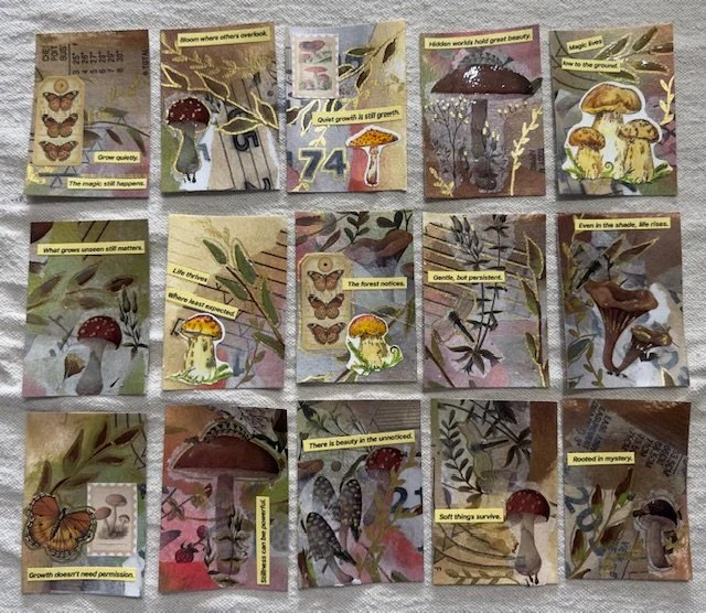 These ACEOs were pulled from a single master board, yet no two feel the same. Mushrooms, leaves, numbers, fragments of text, they appear quietly, almost accidentally. I love that about collage. It mirrors real life. Growth happens in layers, often unnoticed at first.
